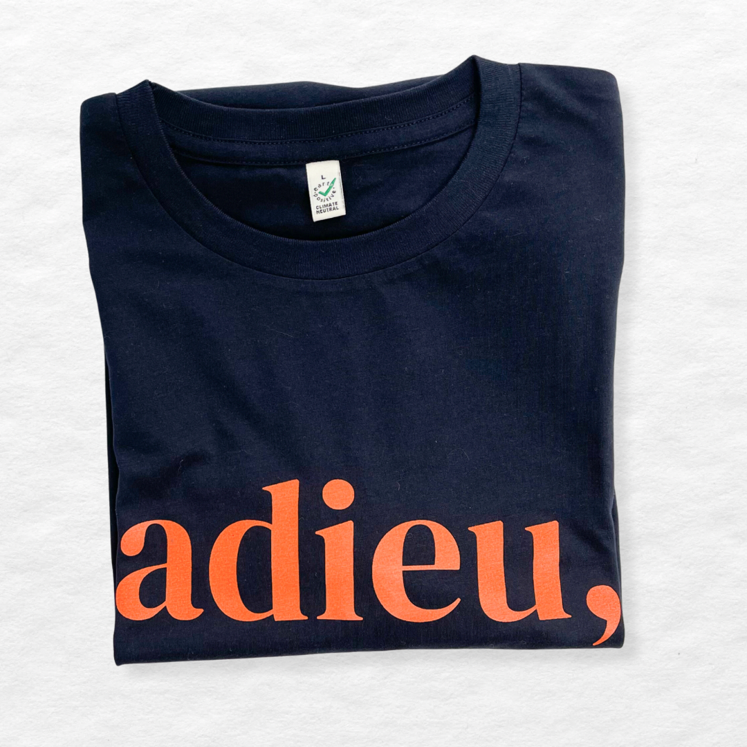 Sag "adieu" zu langweiligen T-Shirts und "hallo" zu deinem neuen Lieblingsshirt. In dunklem Navy Blau mit Print in neon orange ist es das perfekte Statement-Piece!